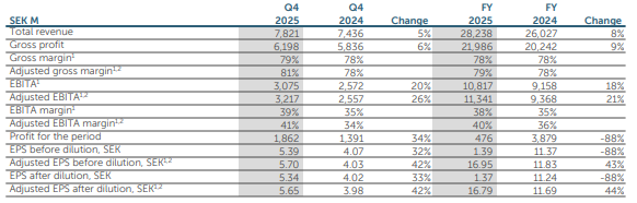 • Earnings per share (EPS) before dilution was SEK 5.39 (4.07) and EPS after dilution was SEK 5.34 (4.02). Adjusted EPS before dilution1 was SEK 5.70 (4.03) and adjusted EPS after dilution1 was SEK 5.65 (3.98)